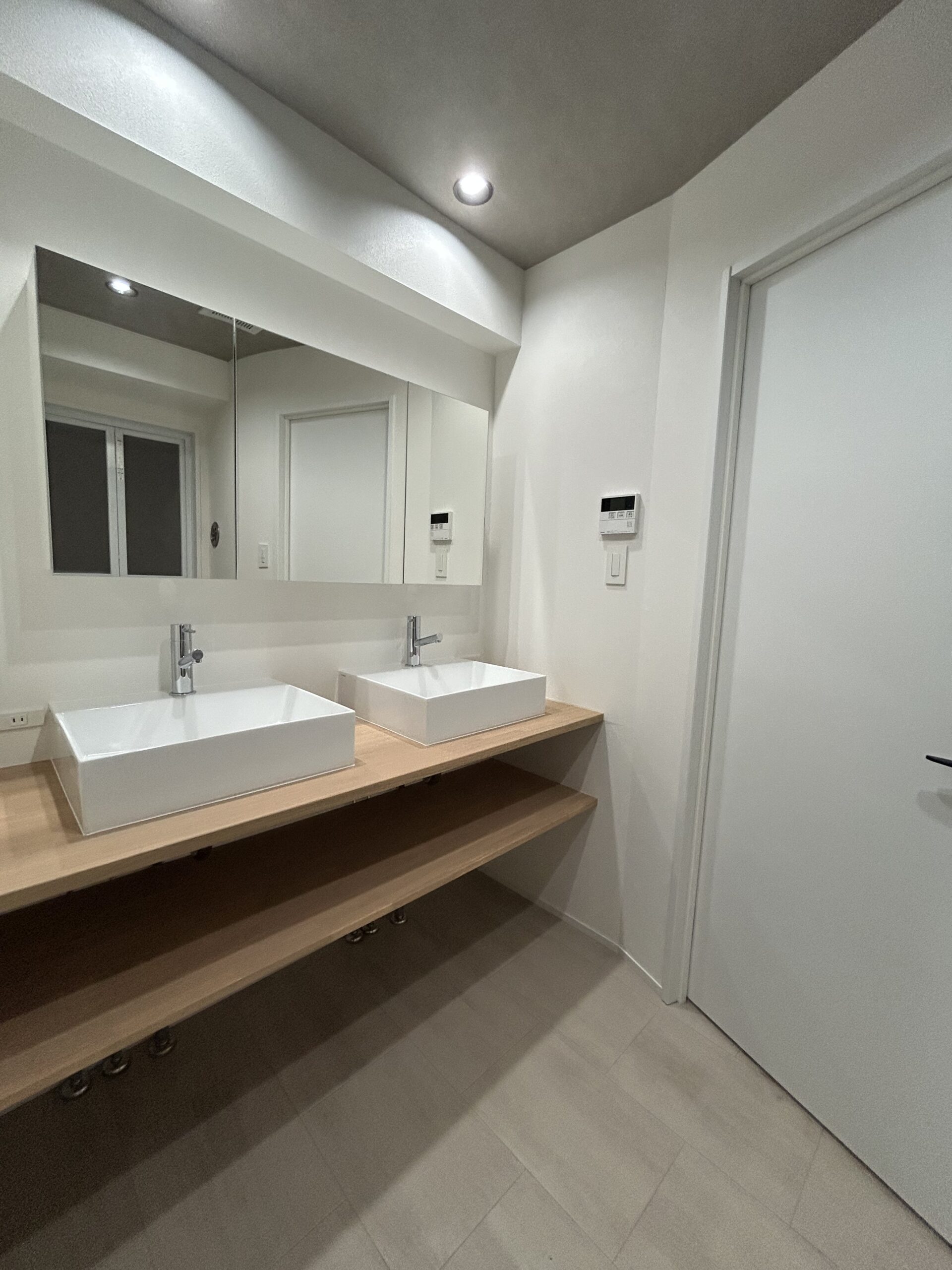 | 内容 | 本格パネル式サウナ新設、チラー付き水風呂造作(タイル・左官工事)、和室から洋室への改装、水まわり設備交換(キッチン・浴室・トイレ・洗面化粧台)、内装リフォーム全般(壁紙・床・エコカラット)、建具交換、電気設備工事(動力申請・照明交換)、ガス配管移設 | 費用 | 〜1600万円 |